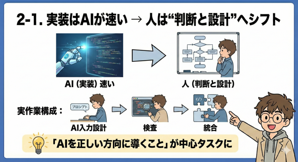 - 2.1 実装は AI、人は判断と設計へ役割が移る