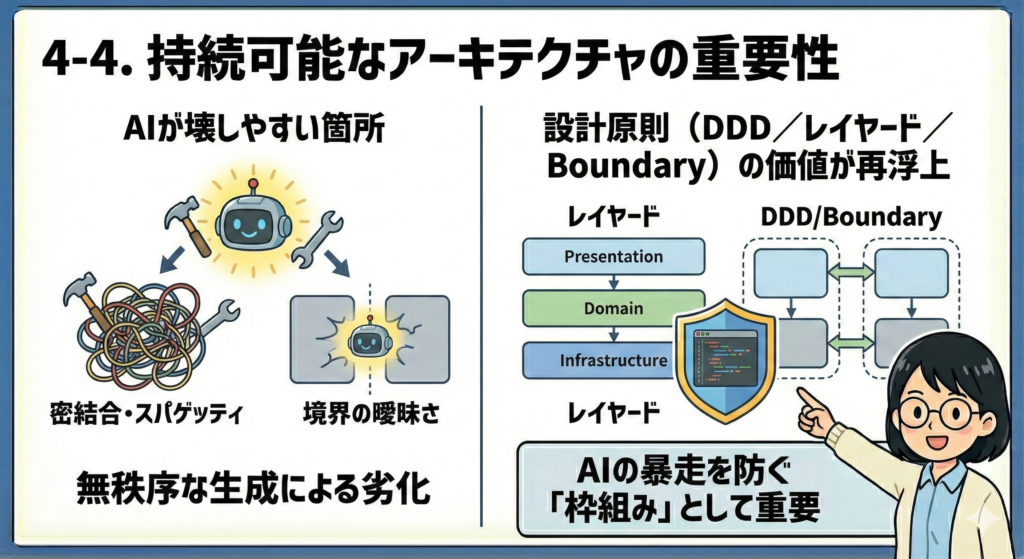 - 6.2 持続可能なアーキテクチャとは「変更に強く、AI の誤差に強い構造」のこと