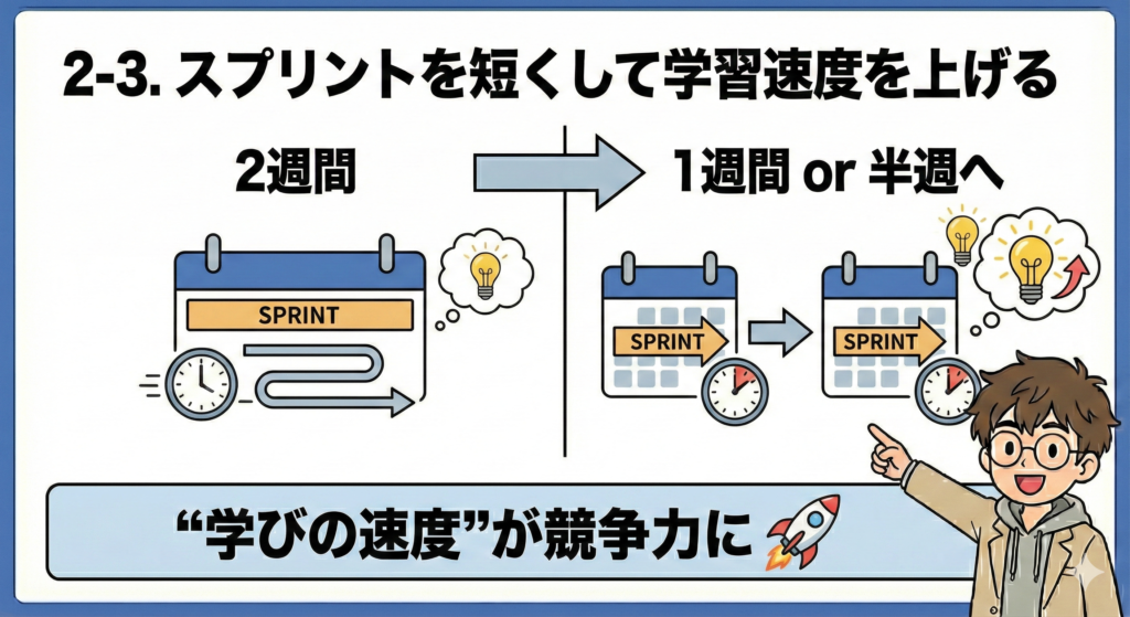 - 2.3 スプリントを短くして「学習速度」を上げることが重要