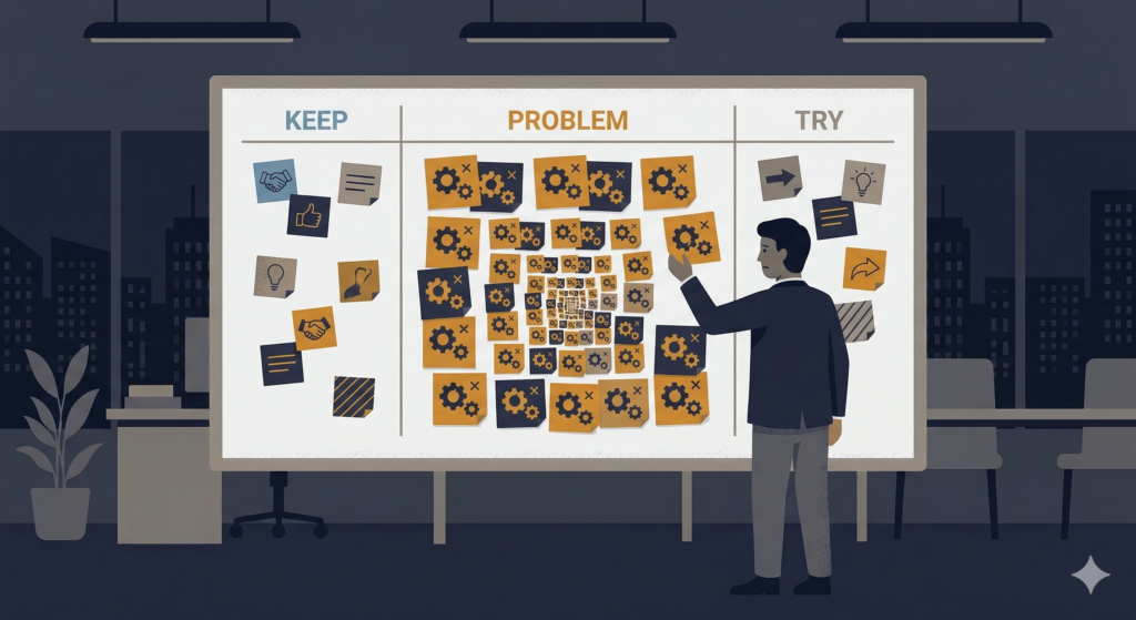 あるチームのレトロスペクティブを想像してください。ファシリテーターが「Keep/Problem/Try」の3列を書いたホワイトボードを用意し、付箋を配ります。20分後、付箋が貼られます。Problemのカラムで最も多いクラスターは「他チームとの連携コスト」——これで4スプリント連続です。