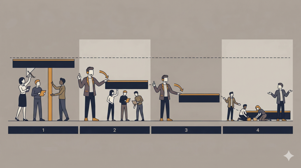 この瞬間、誰一人として「なぜ4回同じ問題が出ているのに解決されないのか」を問いません。本当の問題は連携会議の有無ではなく、チームがアーキテクチャ上の決定権を持っていないことかもしれない。しかし、それを言葉にすることは「場の空気を壊す」ことになる。だから黙って付箋を貼る。