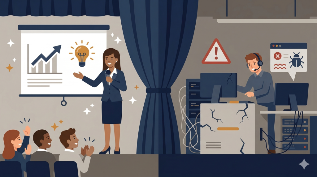 しかし実際には、デモしたメイン機能の裏側には3件の既知のバグがある。パフォーマンスも本番環境では問題が出るかもしれない。ただ、「今日は良い雰囲気で終わりたい」という空気があるので、誰も言いません。